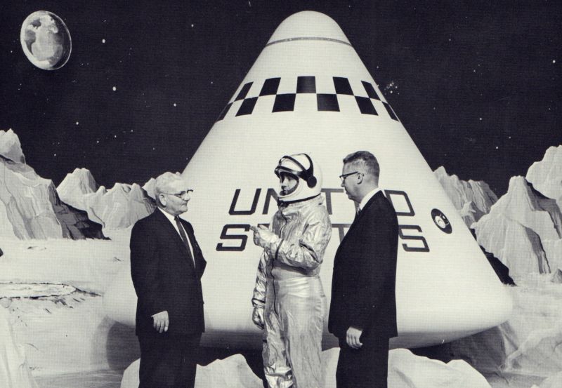 ![]() Collins Development Engineers discuss communications aspects of Apollo project. Company's full-scale spacecraft mock-up is in background. |