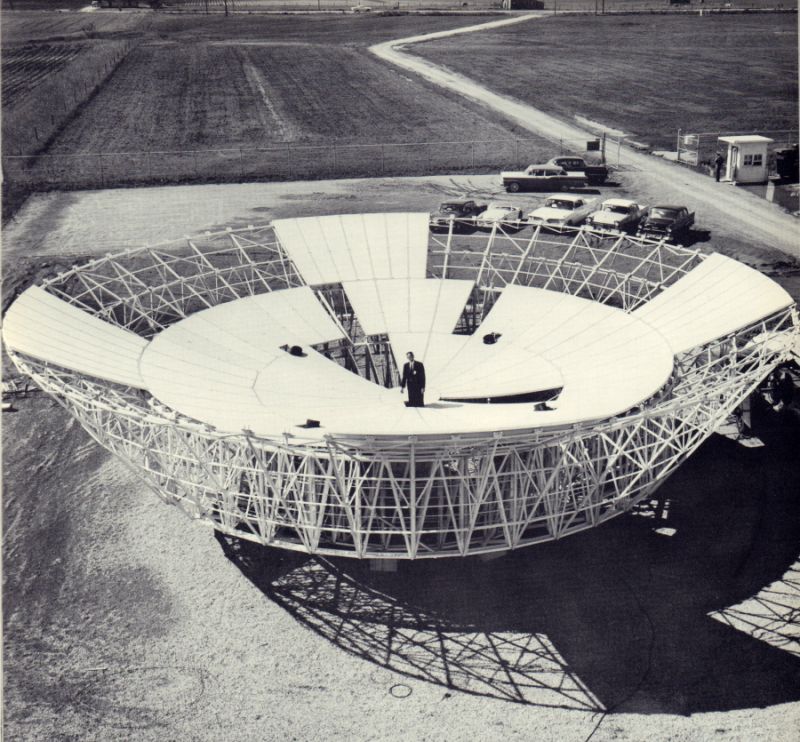 A Collins engineer is dwarfed by the tremendous size of this 60-foot-diameter parabolic reflector for a deep space tracking antenna. The structure under construction at the company plant at Richardson, Texas, is scheduled to be mounted shortly atop a 37-foot-tall tower and will be used in space communication research and development. One of the first jobs of the three-quarter million dollar project will be to test the effectiveness of the Echo II balloon satellite which will be launched this summer. Experiments in voice communication using man-made satellites and solar bodies also are scheduled. When mounted, the antenna, its mount and tower, will measure nearly 76 feet from ground level to feed cone. It is one of the most accurate antennas of its size ever built. |