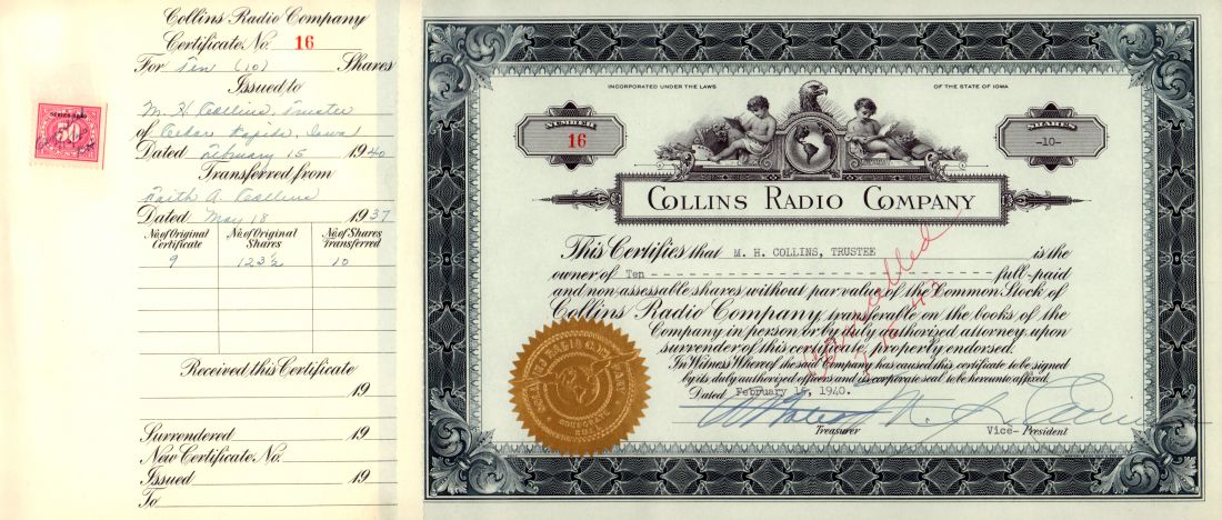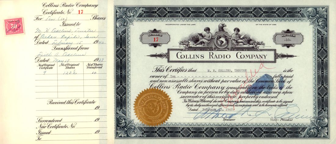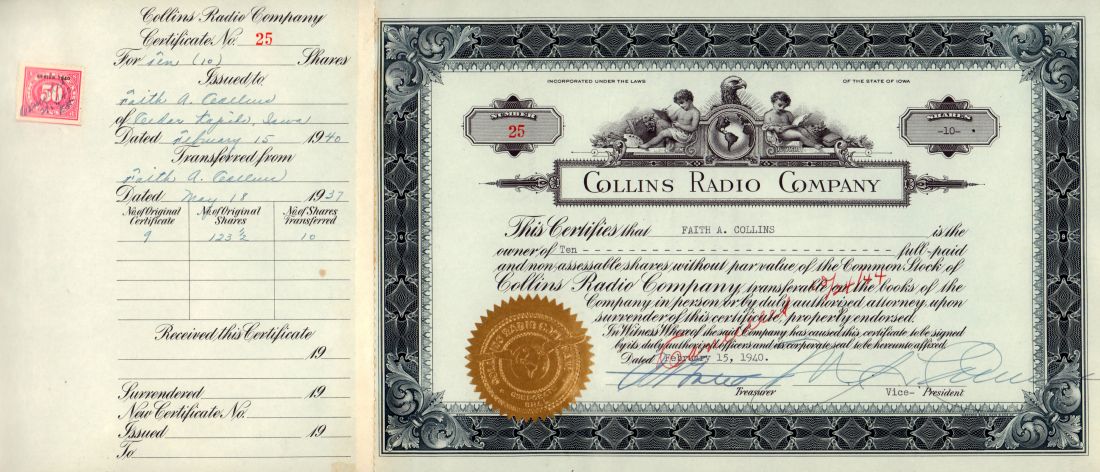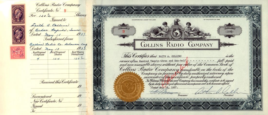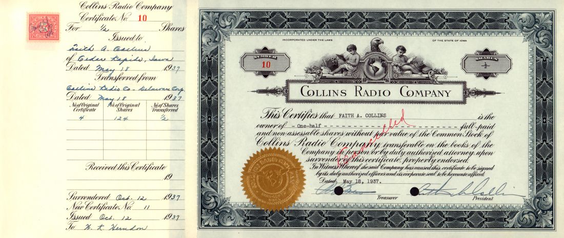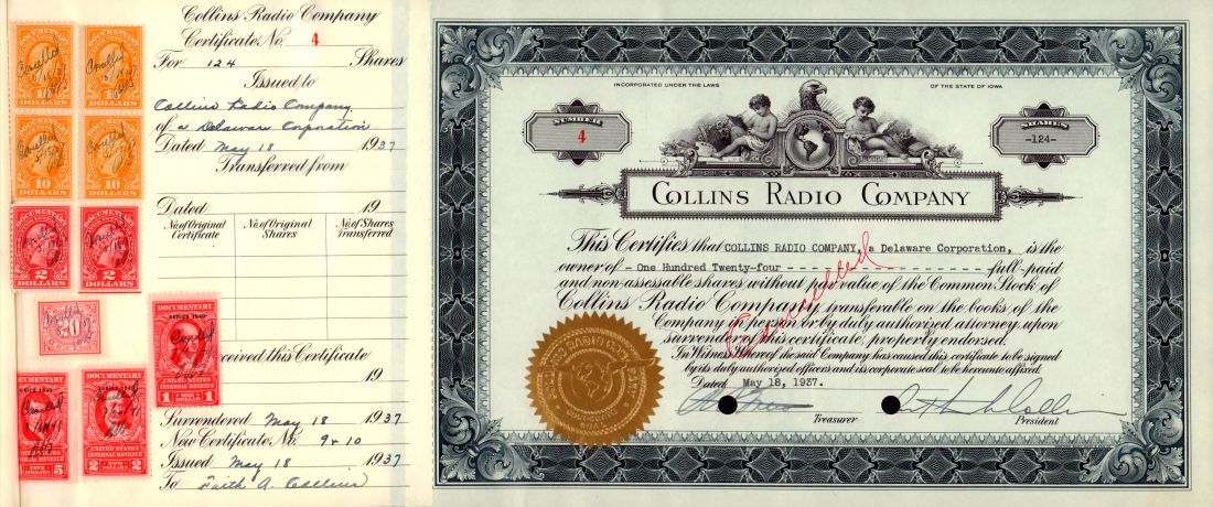| 4 | 124 | 18may1937 | Collins Radio Co. | Delaware Stock | 9 & 10 | 18may1937 | Faith A. Collins | ||