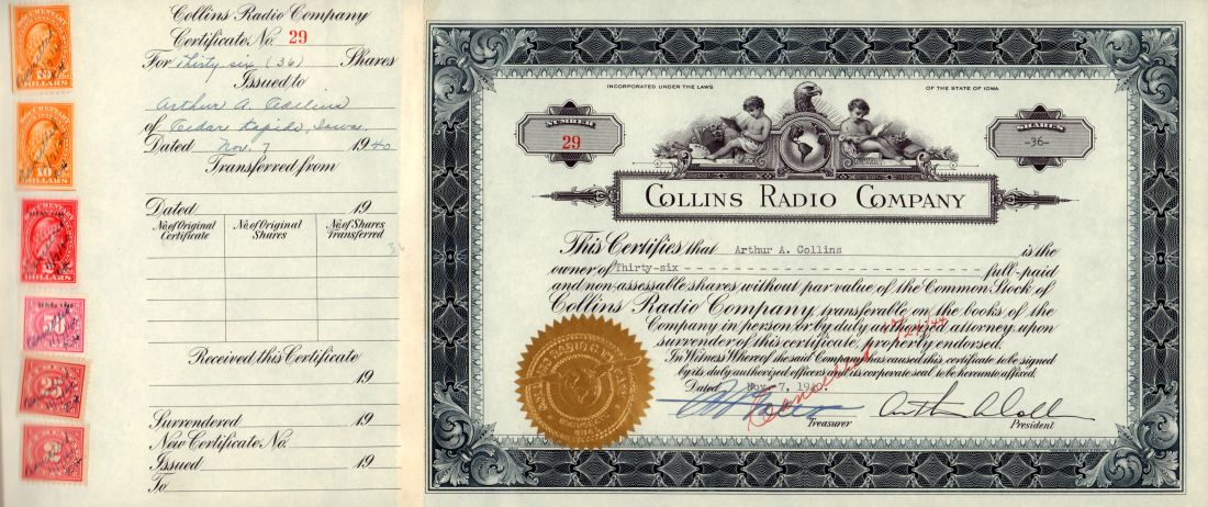 ![]() Certificate number 1 was created from the Delaware-based stock; and later, transferred to Arthur A. Collins as certificate number 5, below. |