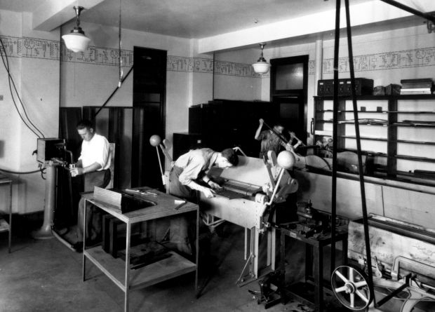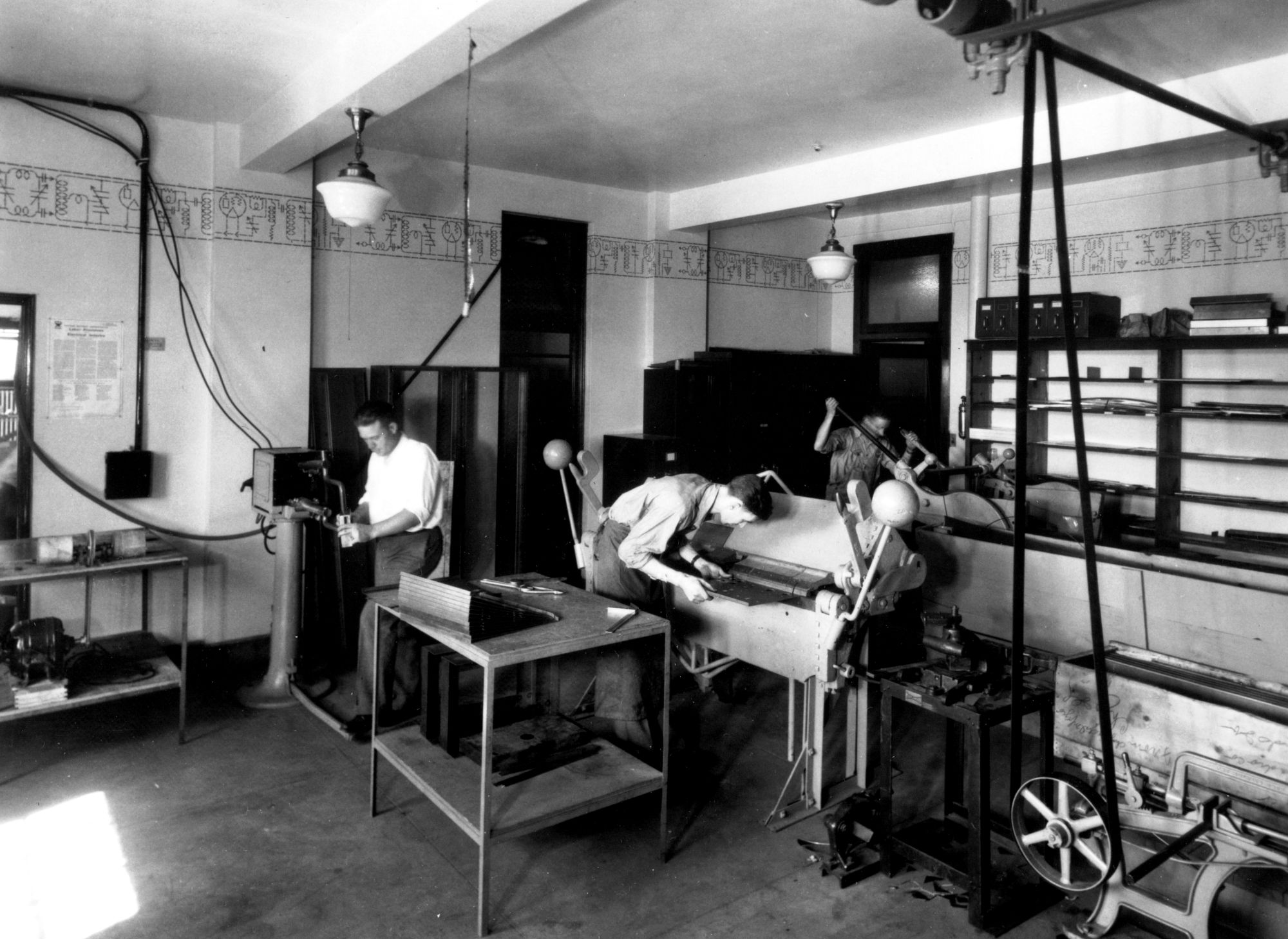 ![]() Photo 6 - Outside Row (backs to the windows): Paul Hauser, Walker Whitmore, Kenny Vaughn, Harry Rogers, Dick Gintert, Buck Holsinger, Les Bessemer (foreman), Dale McCoy, (unidentified), Archie Torsen. Second Row (facing windows): Bob Davis, Ray Stoner, Milo Soukup, Al Keyes. Third Row (facing away from windows): Tom McGregor, Bill Popek, Bruce Miller, Del Zarub, Chuck Hatfield, Claude Hoppe, Leonard Braun, Elmer Koehn. Fourth Row (facing room interior): Charlier Gould, Henry Dmitruk, Don Tubbesing, Arlo Goodyear. |