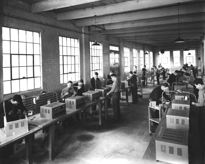 • 32-G assembly Line about 1938 at 2920 1st Ave. Cedar Rapids, Iowa …a very impressive team of employees! |