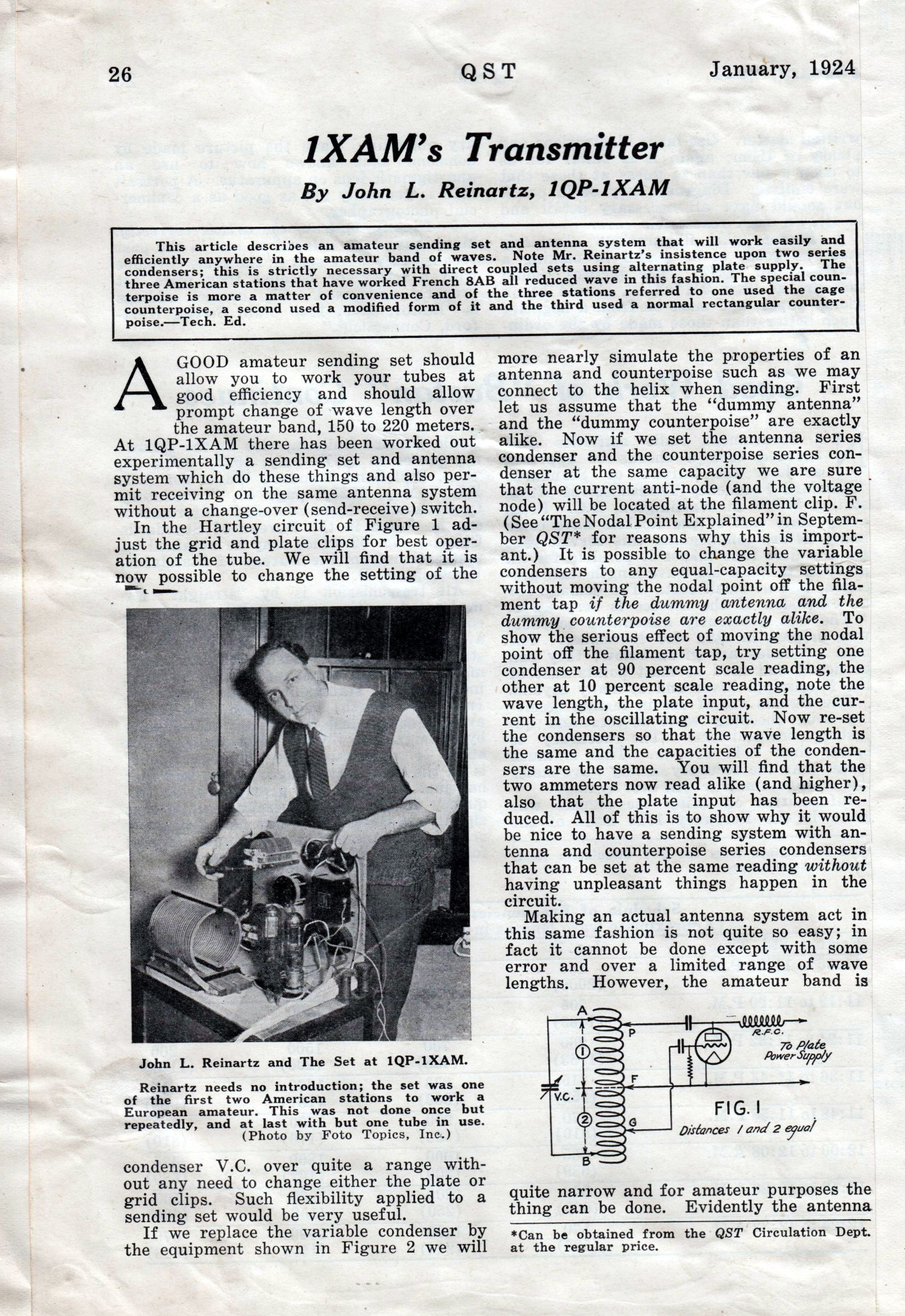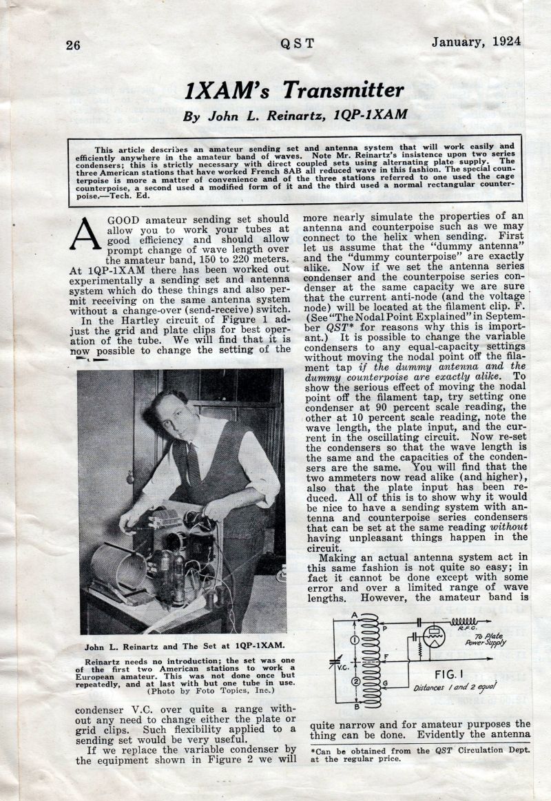 magazine containing an article by John Reinartz (1QP-1XMA). In this article John decribes his Sending Set (transmitter) - giving rise to Arthur's take on that circuitry - later published in the May 1926 issue of