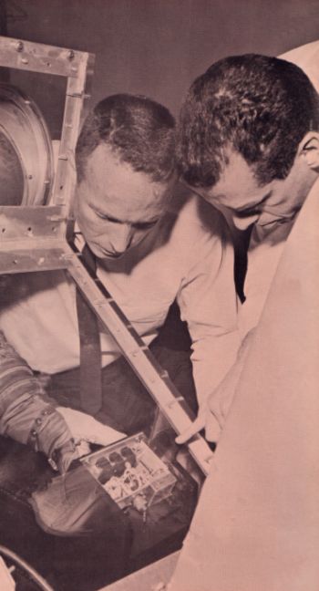 ![]() Communications controls for Project Mercury are tested by Astronaut M. Scott Carpenter (left). The controls are housed in a plexiglass chamber in a pressure suit simulator. |