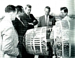 ![]() Project Mercury mockup used for antenna studies is examined by Astronaut Carpenter (second from right) and Collins engineering personnel on a test tower. |