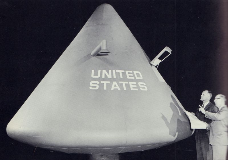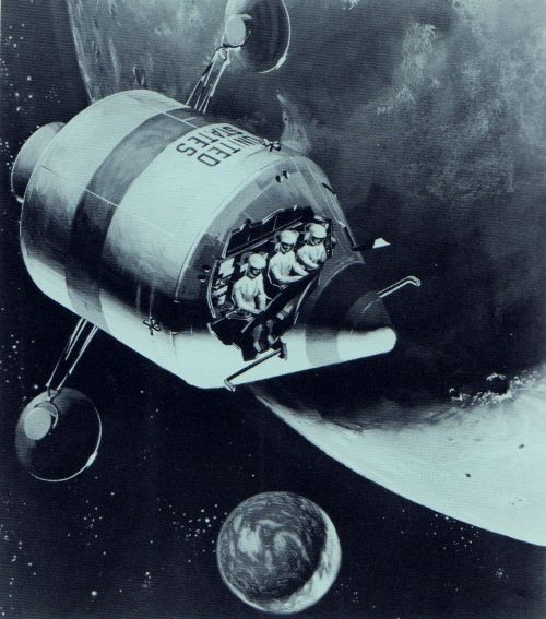 Today the Apollo capsule is made of wood, but in a quick tomorrow it will be the most complex manned spacecraft ever built by the United States and mounted atop a gigantic, multi-stage rocket at Cape Canaveral. Thirteen feet in base diameter, 14 feet high, the grey-painted mock-up is the sure shadow of history that will chronicle the first American explorations of deep space - and if determination has anything to do with it, history's first manned landing on the moon. The complete Apollo spacecraft, as it will be launched from earth on its lunar voyage, will comprise three main modules or sections that will stand five stories high. As presently envisioned, lunar orbit rendezvous technique will be used which would require a single launch of a Saturn C-5 boosting the 13-foot diameter spacecraft. The spacecraft would include a five ton, 12-foot tall command module housing the crew; a 23-ton, 23-foot tall service module providing mid-course correction and return-to-earth propulsion; and a 15-ton, 20-foot tall lunar excursion module. The three modules would proceed to the vicinity of the moon and would be placed in lunar orbit as a unit. Two astronauts would then transfer to the lunar excursion vehicle and descend to the moon while the Apollo mother craft (command-service modules) remains in lunar orbit. |