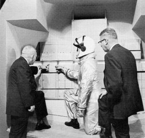 ![]() Collins Development Engineers discuss communications aspects of Apollo project. Company's full-scale spacecraft mock-up is in background. |