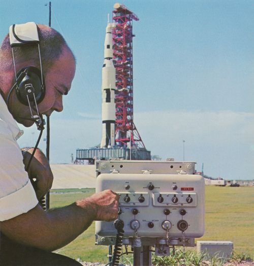 ![]() Engineer checks out Collins communication system at Launch Pad 39A. |