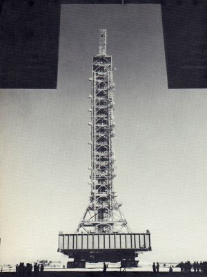 The Mobile Service Structure is a 402-foot-high tower that weighs 12 million pounds. It contains five service platforms to provide 360-degree access to the space vehicle for final servicing at the launch site. The two lower platforms can be adjusted up and down the vehicle, while the three upper platforms have a fixed elevation. The Apollo astronauts will gain access to the spacecraft from one of the upper platforms. Like the Mobile Launchers, the Mobile Service Structure will be carried to a launch site by a Transporter. The Mobile Service Structure will be removed from the pad a few hours prior to launch and returned to its parking area. The two launch pads at LC-39 are approximately four miles from the VAB. Each pad is an eight-sided polygon measuring 3,000 feet across. The major elements of the launch pads include storage tanks for liquid oxygen, liquid hydrogen, and RP-1 propellants; gas compressor facilities, and associated umbilical connection lines necessary for launching the space vehicle. The top of each pad is equipped with steel support pedestals for positioning a Mobile Launcher and the Mobile Servicing Structure. |
