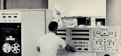 ![]() An engineer checks out the 30-foot antenna (visible through window) from control console. Part of the S-Band digital data equipment is shown on the left. The antenna ball tracker is at right. |