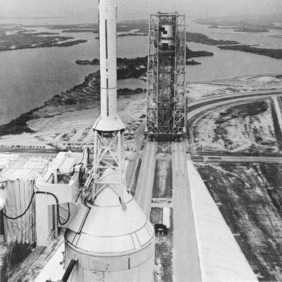 ![]() View from atop Apollo 4 before launch from Kennedy Space Center shows approaching mobile service structure, which is used to ready launch vehicle and spacecraft for flight. |