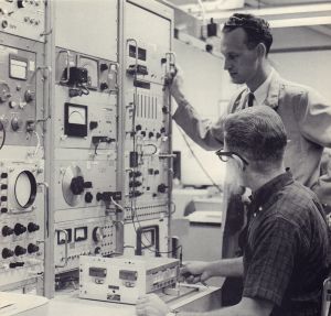 ![]() Collins test technician and supervisor conduct bench test of Apollo command module communications and data system equipment. |