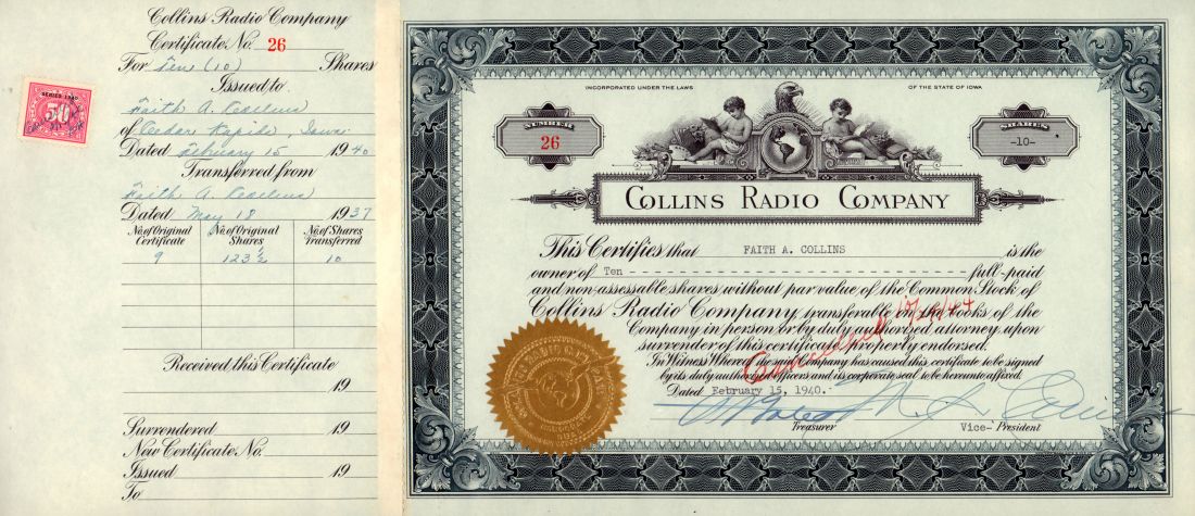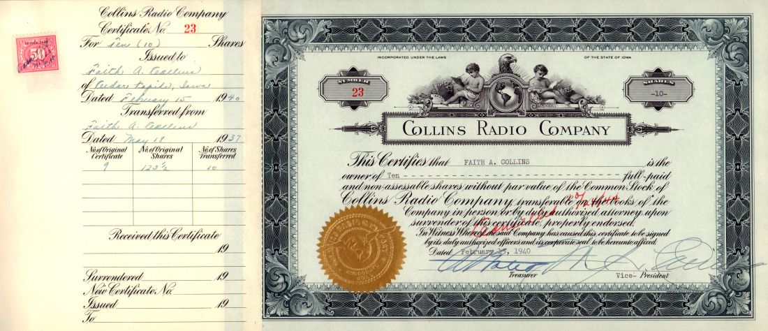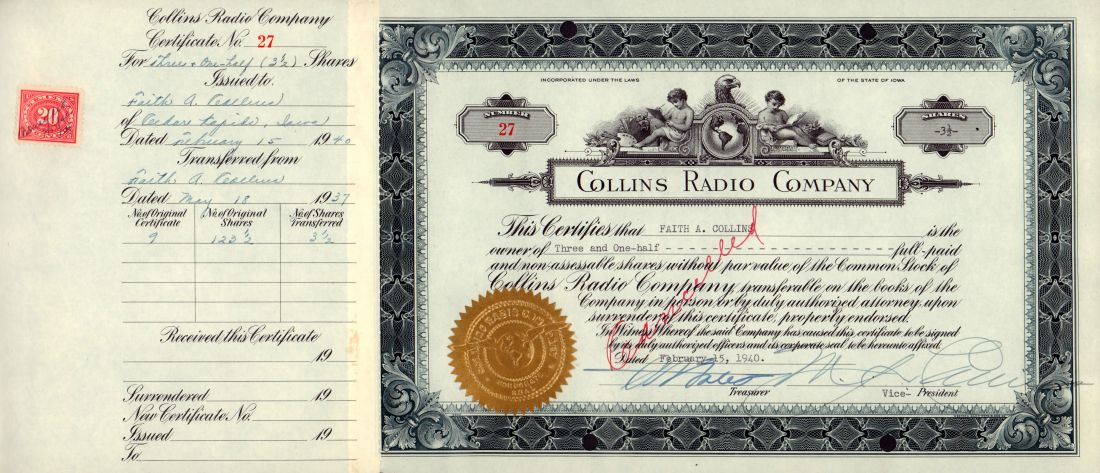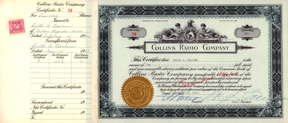 4 | 124 | 18may1937 | Collins Radio Co. | Delaware Stock | 9 & 10 | 18may1937 | Faith A. Collins | ||