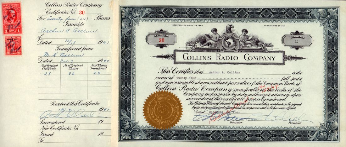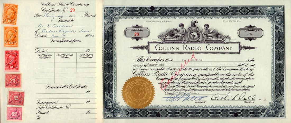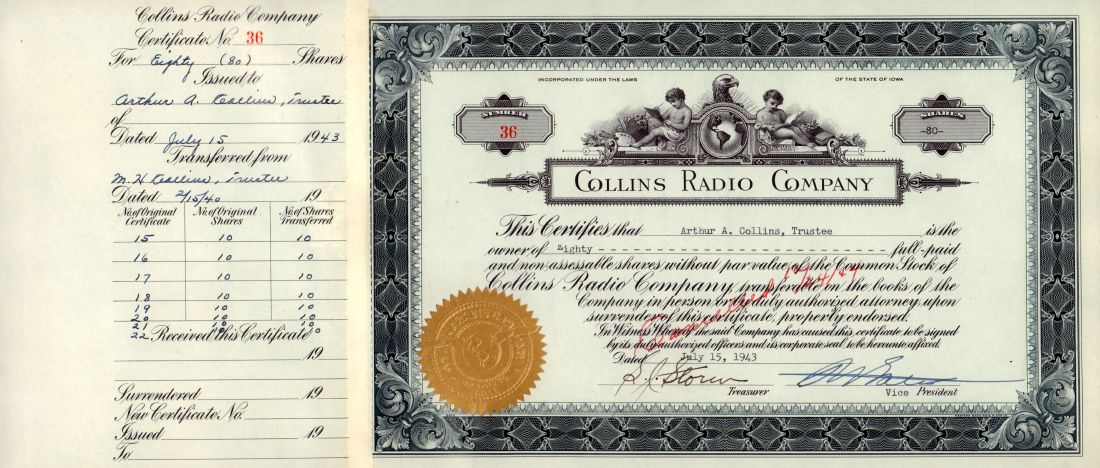 ![]() Certificate number 1 was created from the Delaware-based stock; and later, transferred to Arthur A. Collins as certificate number 5, below. |