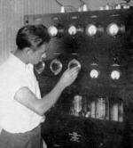 In the photo, Radio Operator, Guy Hutcheson, is tuning the 1KW 20B transmitter.