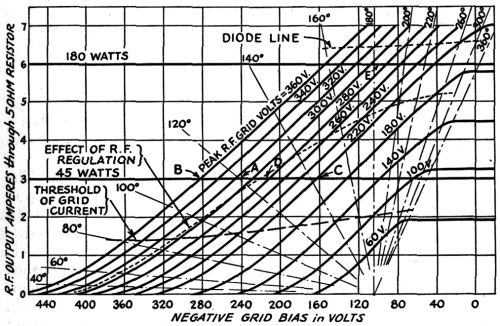 It is interesting to observe that if the excitation and bias were adjusted to correspond to the operating point “D”, and so that peak output occurs at “E” with an operating angle of 180°, the tube would function at peak output exactly as if it were a Class-B linear amplifier.