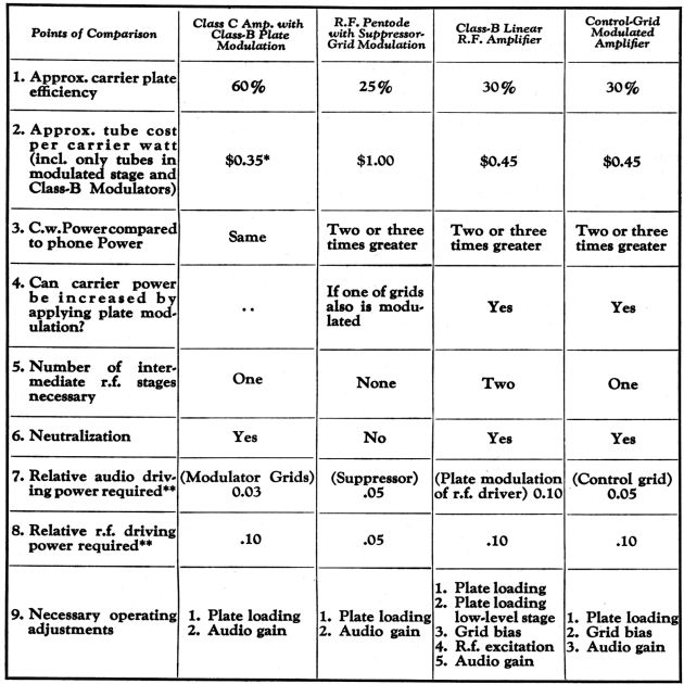 It will be seen that Class-B plate modulation still compares favorably with the other systems, retaining the advantages of low tube cost, low distortion and simple operating equipment.