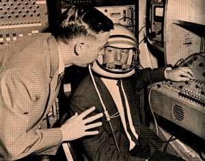 ![]() Communications controls for Project Mercury are tested by Astronaut M. Scott Carpenter (left). The controls are housed in a plexiglass chamber in a pressure suit simulator. |