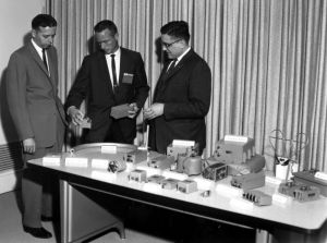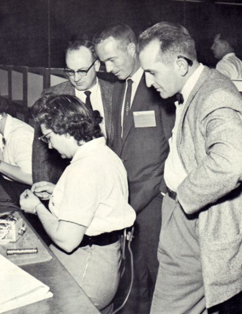 ![]() M. Scott Carpenter (center) during his visit to the CR Division of Collins, toured the production lines where workers are assembling components for capsule simulation. |