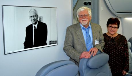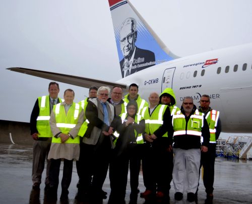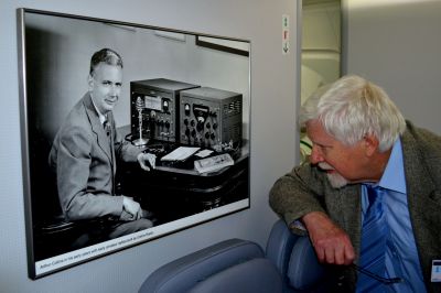 Arthur Collins' son, Michael Collins reports: “In the summer of 2017 I was contacted by Dave Yeoman of Rockwell Collins, who passed on a request from Norwegian Air asking me, as a representative of the Collins family, for permission to so honor Arthur Collins. In addition to signing an agreement, they asked for pictures of AAC to be used in direct rendition as well as a basis for artwork for the tail fin image. Rod Blocksome and I gathered several images of proper content and resolution. After submitting these, we were told to expect a spring 2018 rollout and handover from Boeing to NA. Dave Yeoman and I both tried to obtain a date as spring approached. At the last moment, Boeing and NA asked if I would like to visit during the handover, a date was proposed, and then abruptly changed to a week earlier. My wife Pat and I gratefully accepted and flew to Seattle on March 8. Corey Moseley, head of the RC field office on site at Boeing, kindly drove us to Boeing on an appropriately rainy morning, where we were graciously treated to breakfast and a brief ceremony. We then drove to the newly-certified-for-handover 787 and given a tour around and inside the aircraft. I enclose a shot of Corey explaining the basic functions of the RC glass cockpit. This was poignant for me since I grew up around airplanes and flew with Dad as pilot in a succession of aircraft. We were building the FD-108/9 when I worked for Fred Johnson and Harry Passman in Cedar Rapids in the mid 1960s.” |
