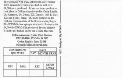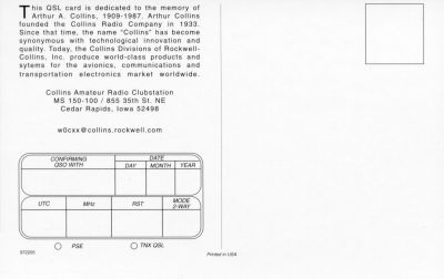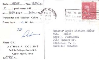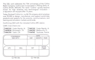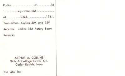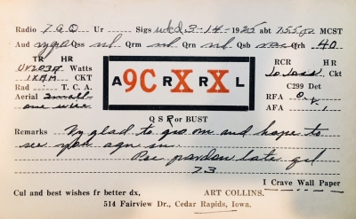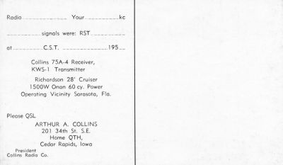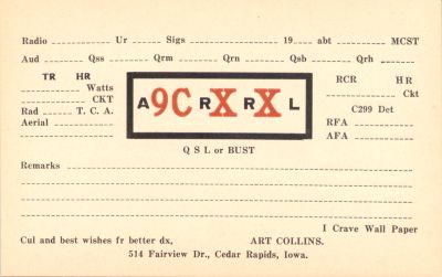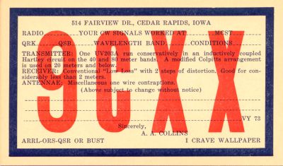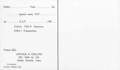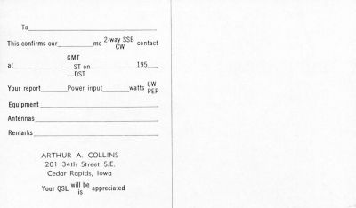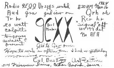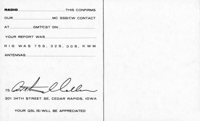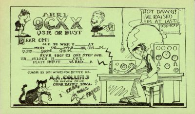 Almost all Amateur Radio Operators, then and now, use QSL post cards to complete their radio contacts with fellow “Hams”. Besides the station’s call sign, they generally include the date & time, band (or frequency) used and a note about the reception quality. If there is room on the card; the type of transmitter, power output and antenna are mentioned. These post cards are just the right size to decorate the collector's “shack” walls - as reminders of a successful contact. |